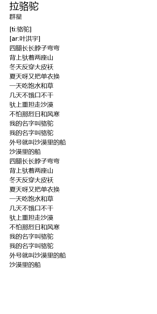 | [00:43.936] | 我的名字叫骆驼 |