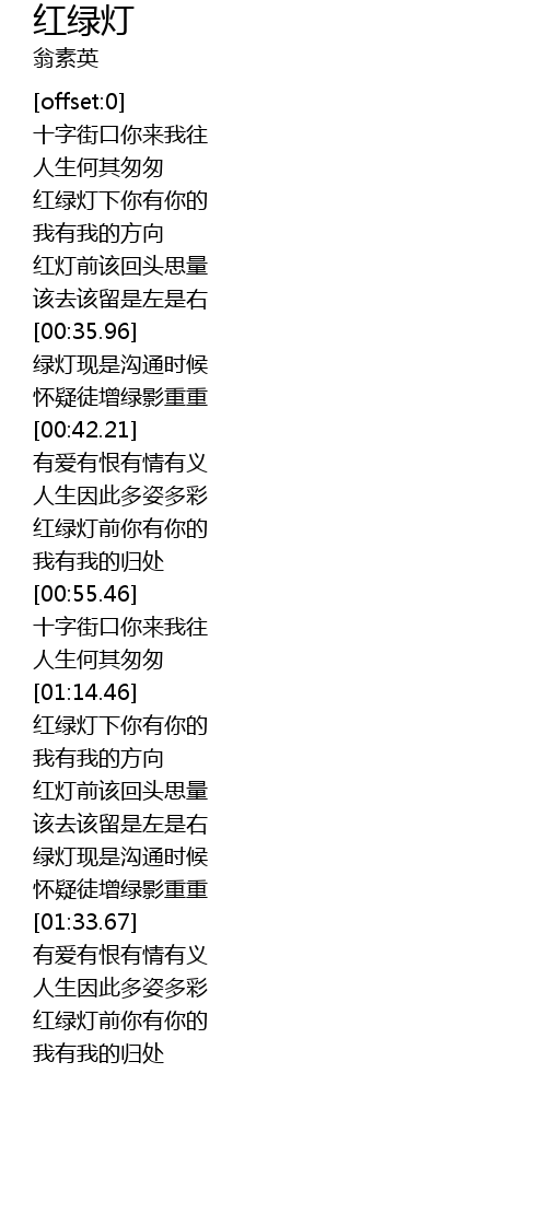 | [00:23.77] | hóng lǜ dēng xià nǐ yǒu nǐ de |