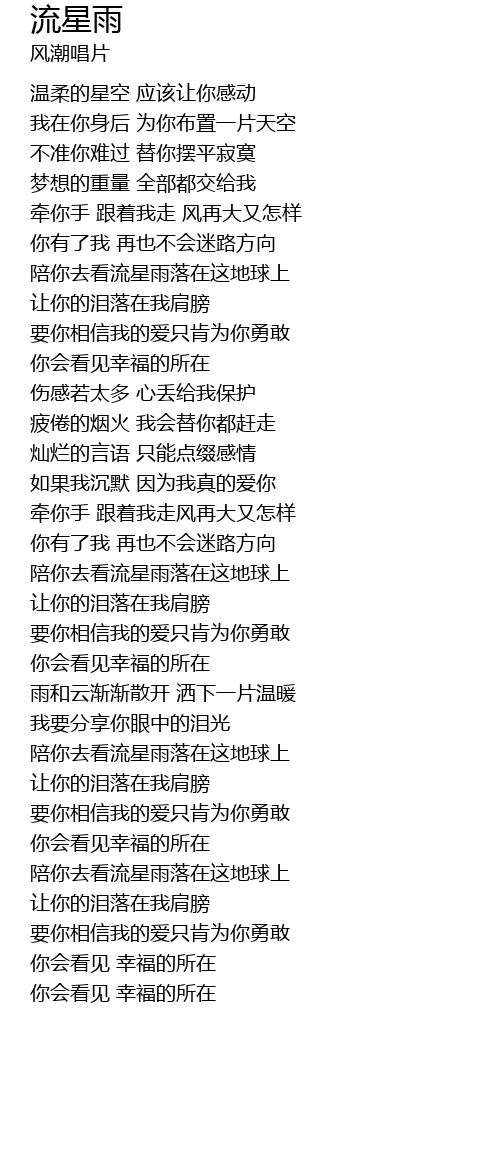 | [03:45.92] | péi nǐ qù kàn liú xīng yǔ luò zài zhè dì qiú shàng |