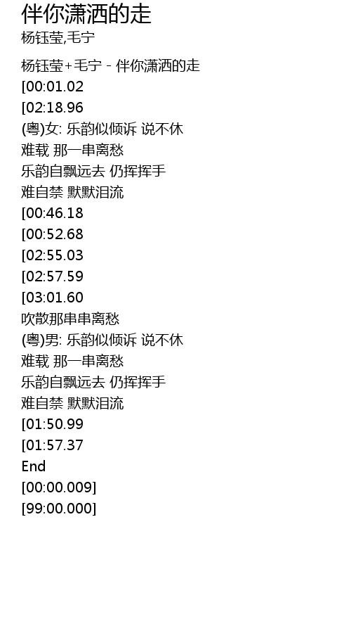 | [00:00.100] | 杨钰莹+毛宁-伴你潇洒的走 |