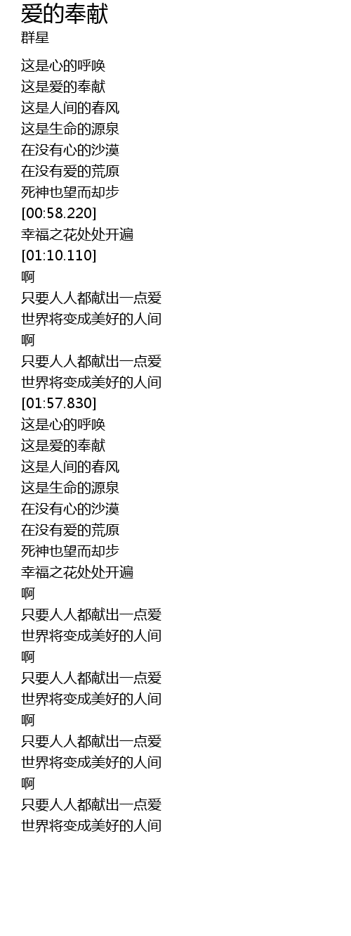 | [01:15.370] | zhǐ yào rén rén dōu xiàn chū yì diǎn ài |