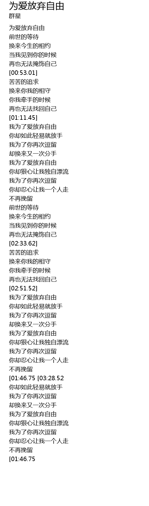 | [03:27.29][01:46.75 [03:28.52] | 我为了爱放弃自由 |