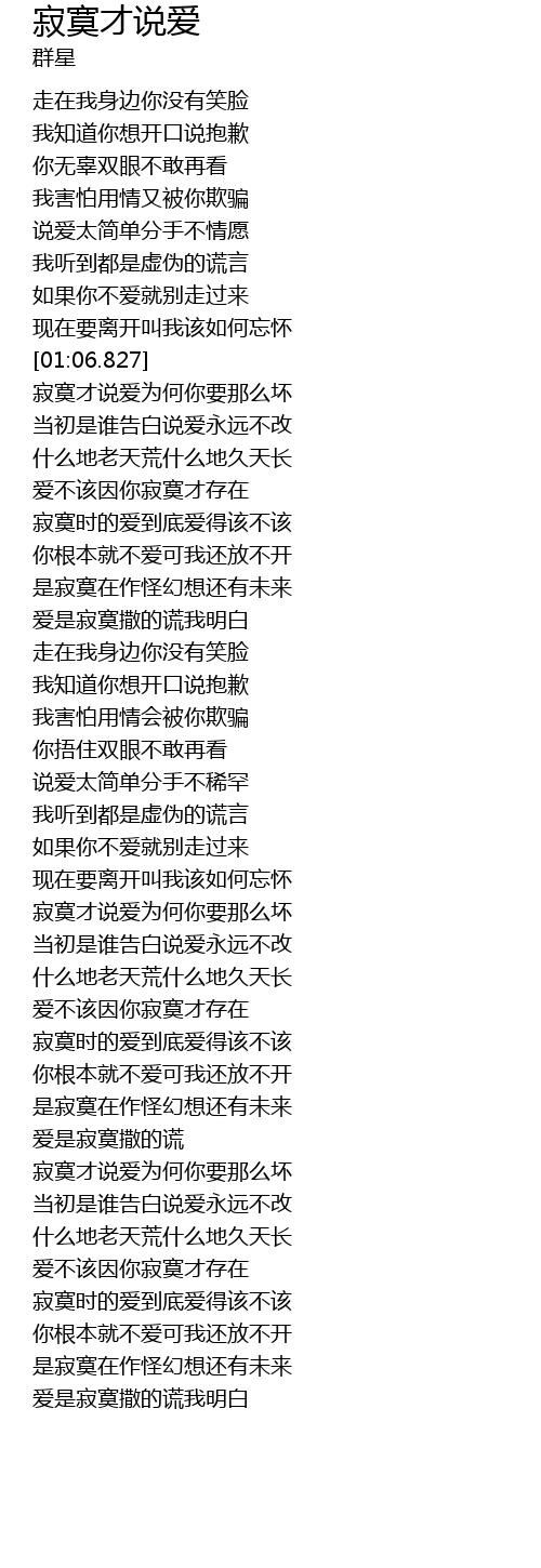 | [01:10.367] | jì mò cái shuō ài wèi hé nǐ yào nà me huài |