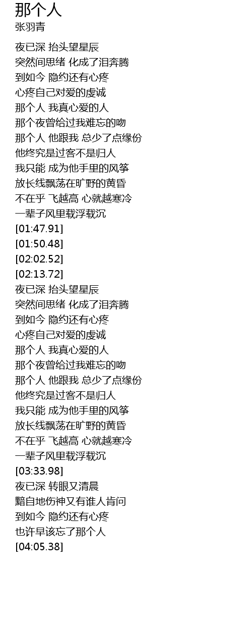 | [01:05.63] | 那个人 他跟我 总少了点缘份 |