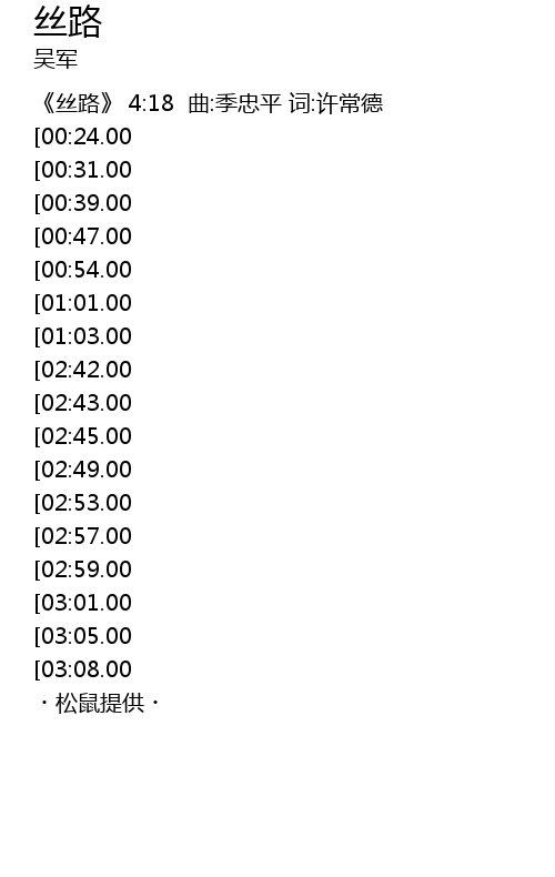 | [00:00.00] | 《丝路》 4:18 曲:季忠平 词:许常德 |