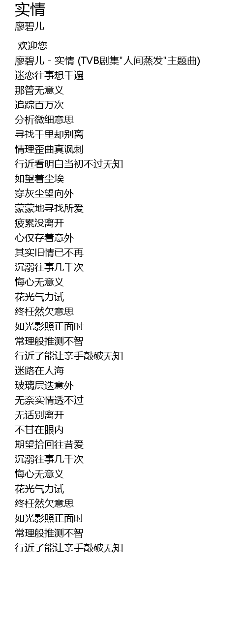 | [00:05.53] | 廖碧儿 - 实情 (TVB剧集"人间蒸发"主题曲) |
