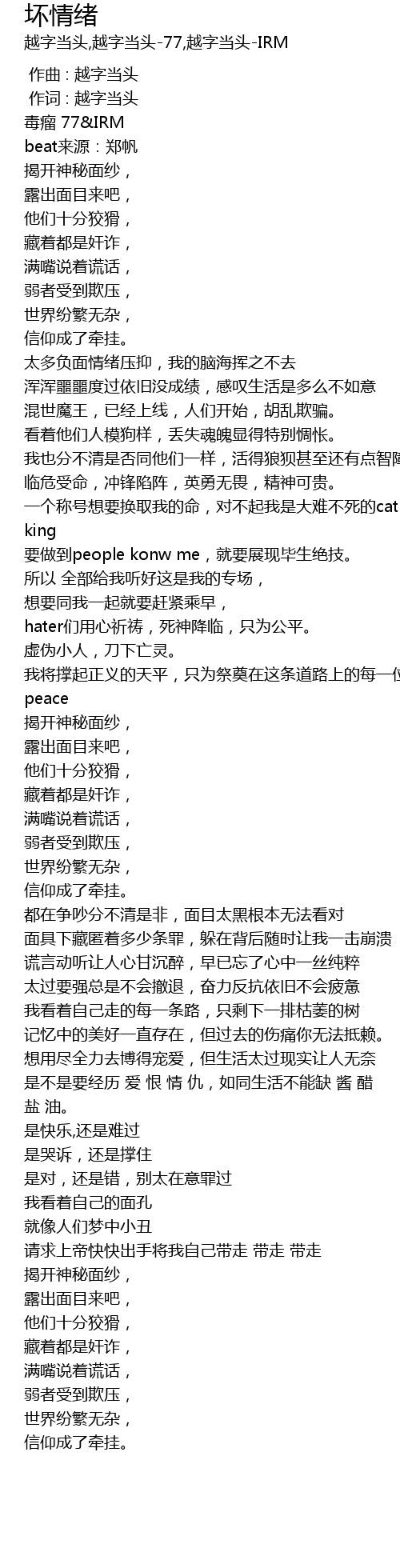 | [01:18.357] | 面具下藏匿着多少条罪,躲在背后随时让我一击崩溃 |