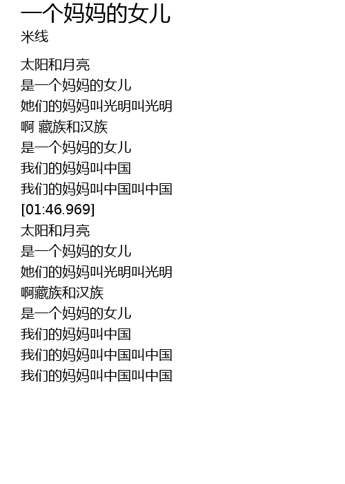 | [01:33.99] | 我们的妈妈叫中国 |
