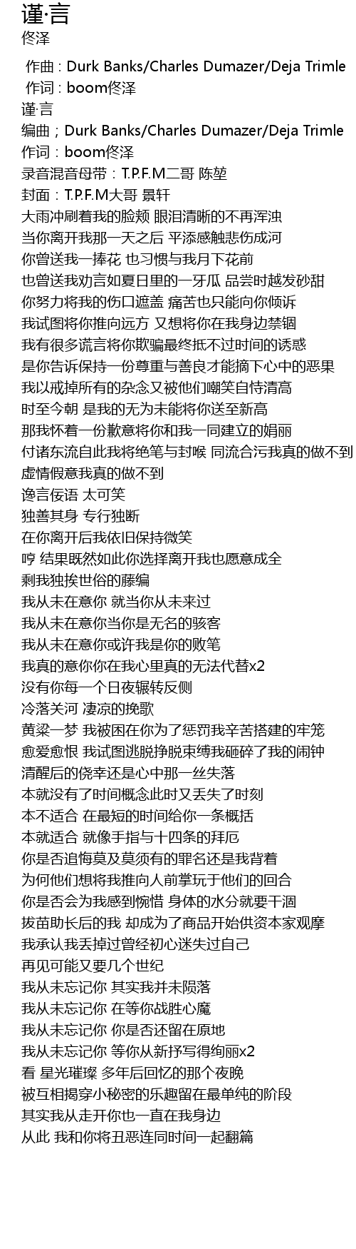 | [00:18.15] | 录音混音母带:T.P.F.M二哥 陈堃 |