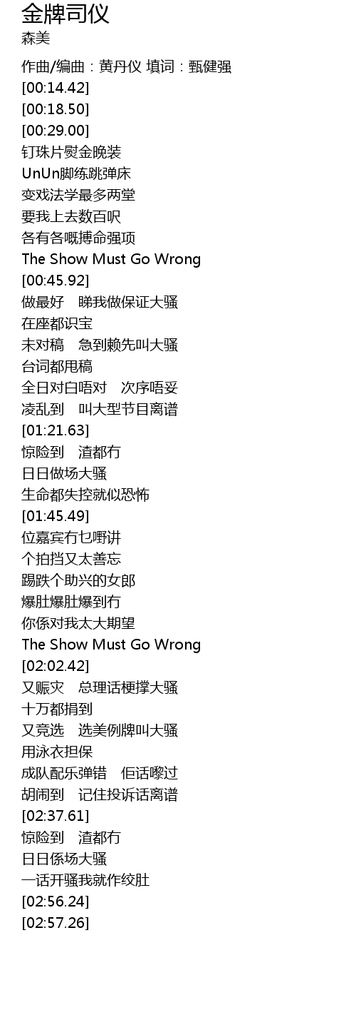 | [02:16.69] | 成队配乐弹错 佢话嚟过 |
