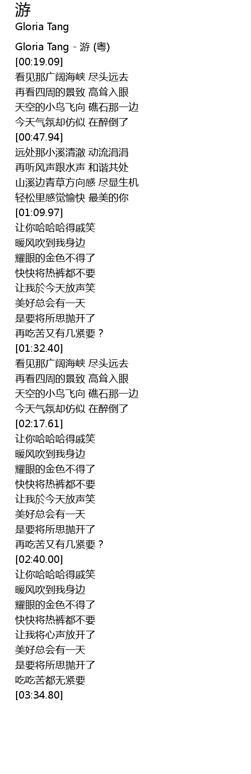| [00:00.20] | Gloria Tang - 游 (粤) |