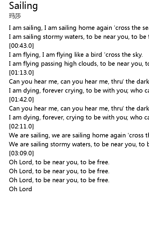 | [00:15.0] | I am sailing, I am sailing home again 'cross the sea. |