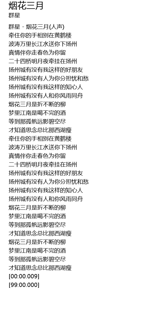 | [00:00.00] | 群星 - 烟花三月(人声) |