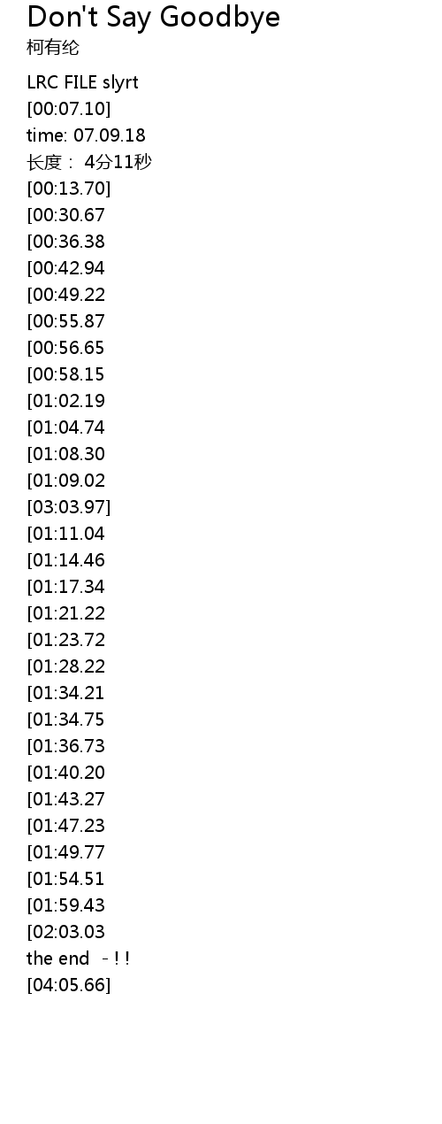 | [03:31.41][01:34.75] | Don\'t Say Goodbye |