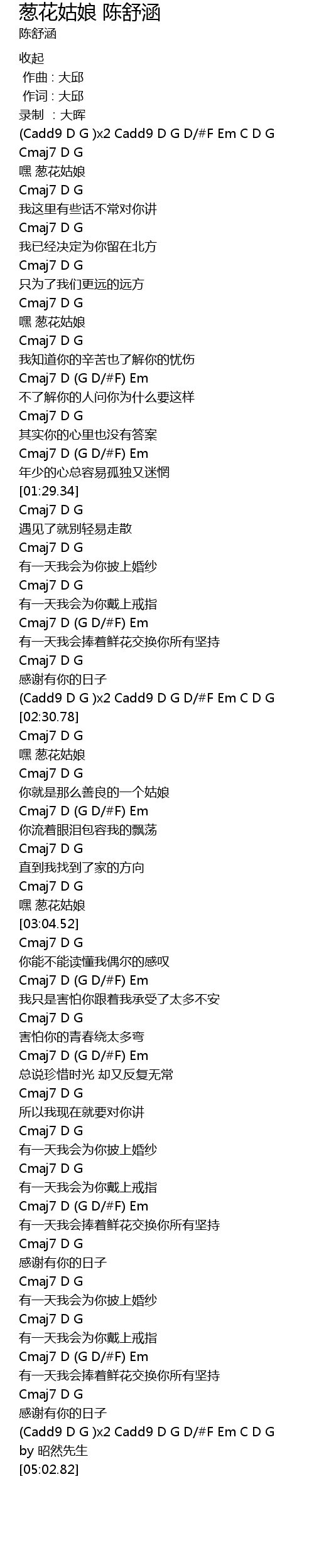 | [02:29.78] | (Cadd9 D G )x2 Cadd9 D G D/#F Em C D G |