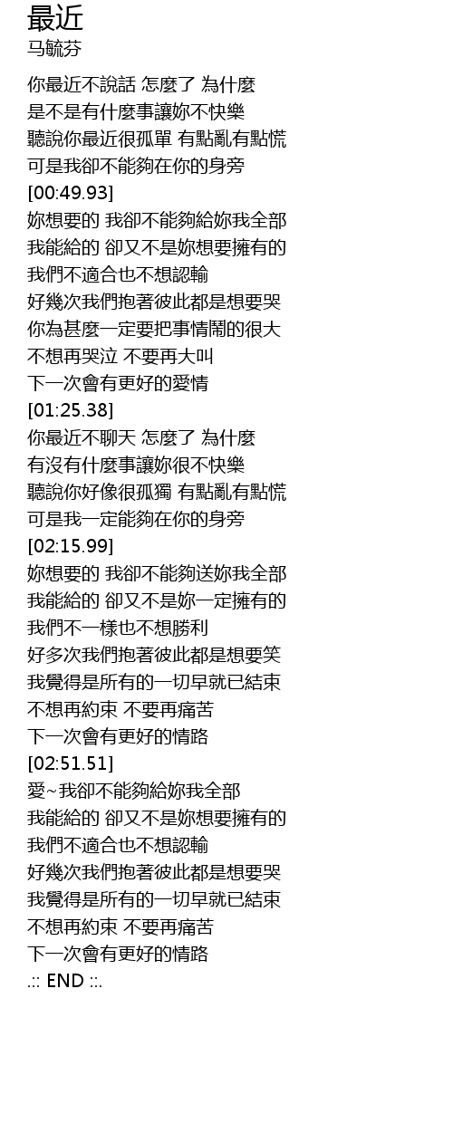 | [00:18.09] | 你最近不說話 怎麼了 為什麼 |