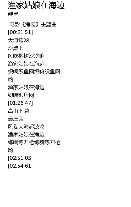 | [02:59.07][02:51.03] | 渔家姑娘在海边 |