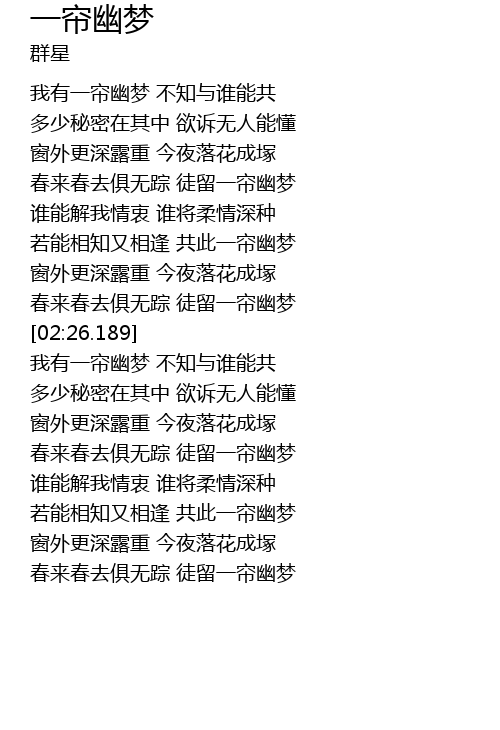 | [02:46.699] | 我有一帘幽梦 不知与谁能共 |