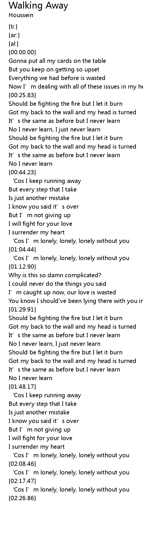 | [00:38.54] | Got my back to the wall and my head is turned |