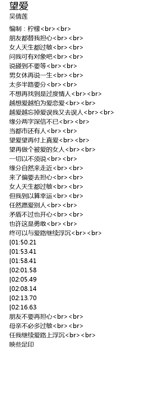 | [03:07.65][02:08.14] | 望再做个被爱的女人<br><br> |