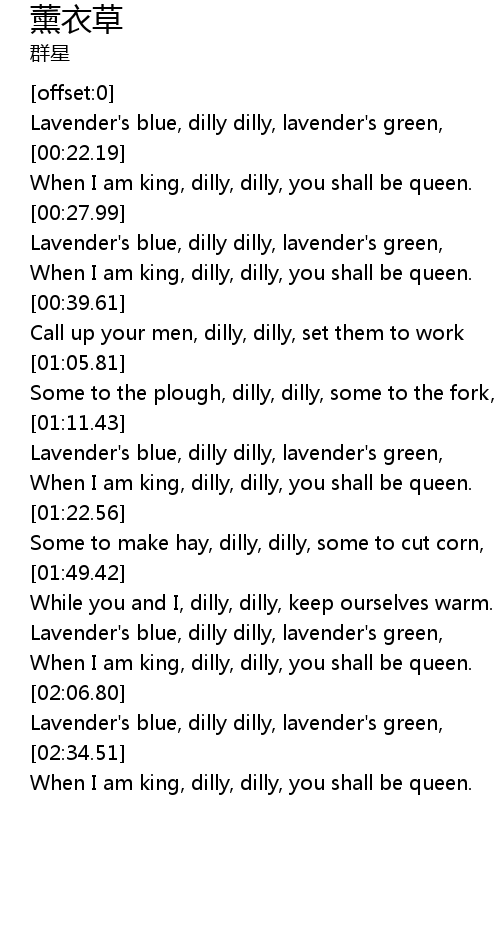 Lavender's blue, dilly dilly, lavender's green, |