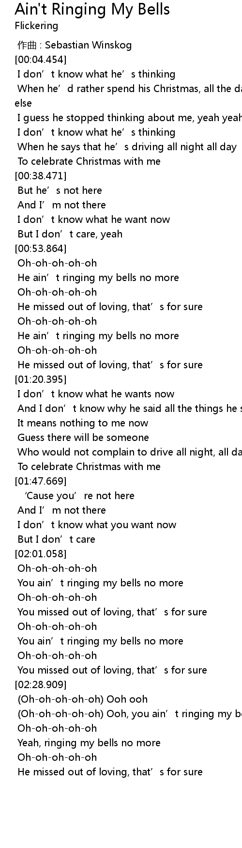 | [02:35.987] | (Oh-oh-oh-oh-oh) Ooh, you ain’t ringing my bells, no |