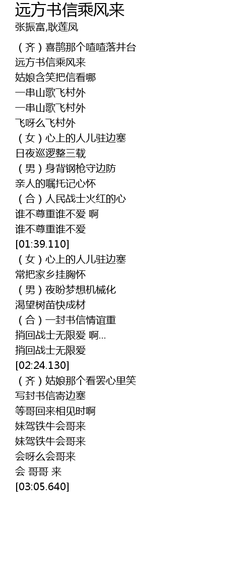 | [00:46.440] | 姑娘含笑把信看哪 |