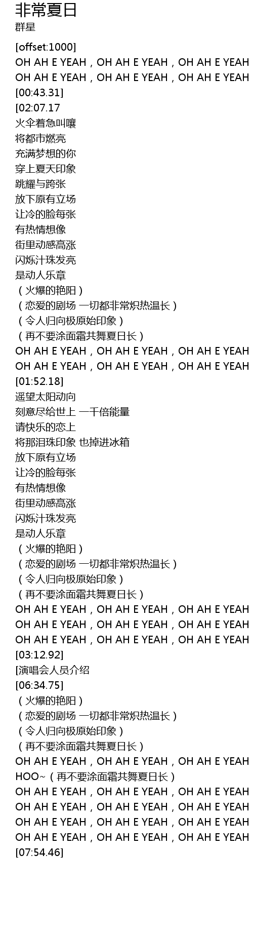 | [07:12.00] | OH AH E YEAH,OH AH E YEAH,OH AH E YEAH HOO~(再不要涂面霜共舞夏日长) |