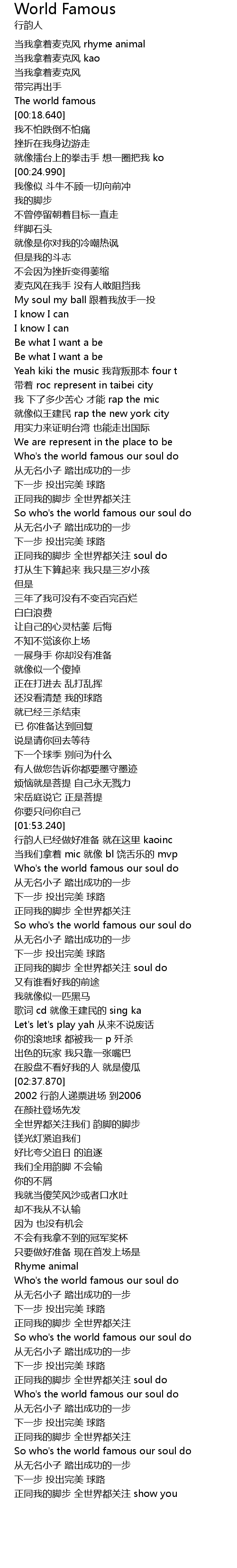| [03:03.390] | Who's the world famous our soul do |