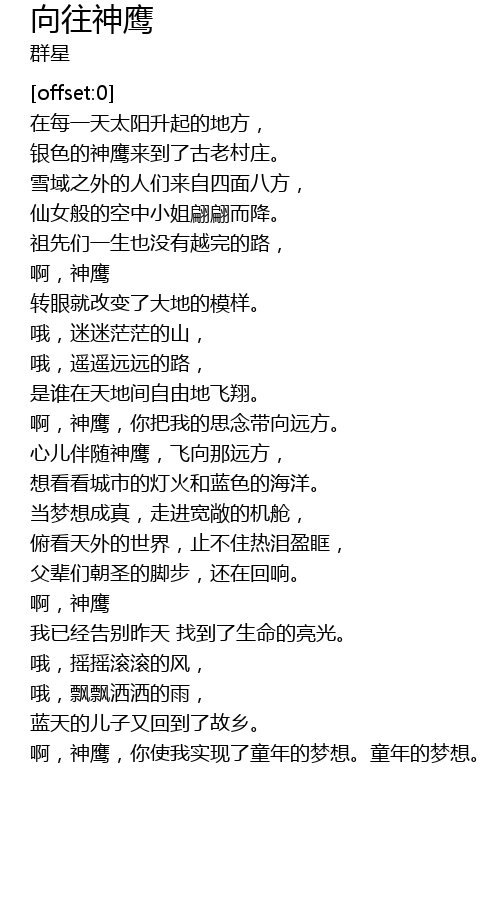 | [04:49.40] | 啊,神鹰,你使我实现了童年的梦想。童年的梦想。 |