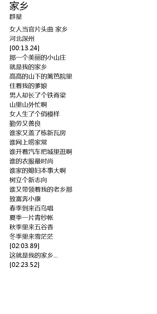 | [00:04.18] | 女人当官片头曲 家乡 |