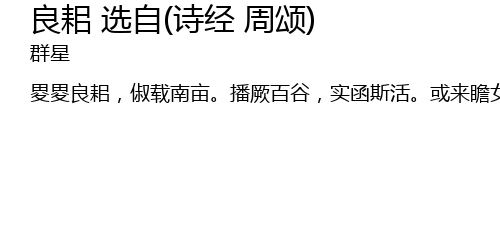 | 畟畟良耜,俶载南亩。播厥百谷,实函斯活。或来瞻女,载筐及莒,其饟伊黍。其笠伊纠,其镈斯赵,以薅荼蓼。荼蓼朽止,黍稷茂止。获之挃挃,积之栗栗。其崇如墉,其比如栉。以开百室,百室盈止,妇子宁止。杀时犉牡,有捄其角。以似以续,续古之人。 |