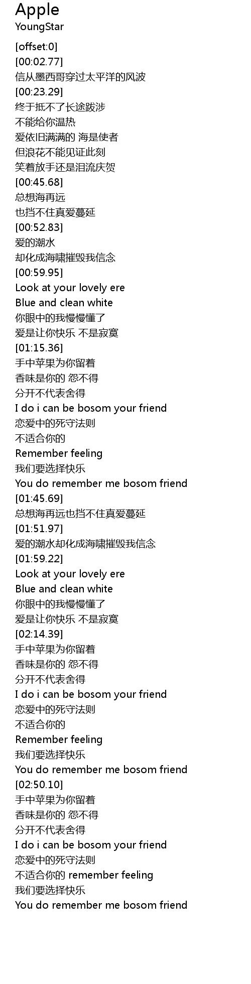 | [02:20.56] | shǒu zhōng píng guǒ wèi nǐ liú zhe |
