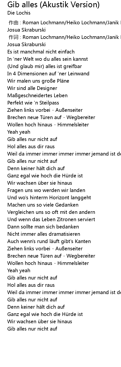 | [00:01.000] | zuò cí : Roman Lochmann Heiko Lochmann Janik Riegert Beatgees Tapen Josua Skraburski |