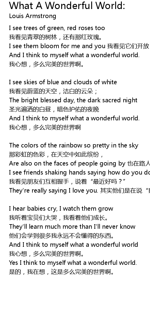 | And I think to myself what a wonderful world. wo xin xiang, duo me wan mei di shi jie a | |