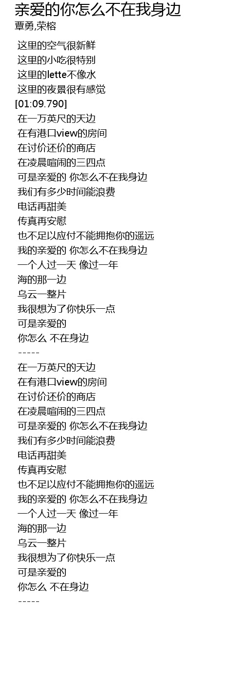 | [01:32.899] | 可是亲爱的 你怎么不在我身边 |