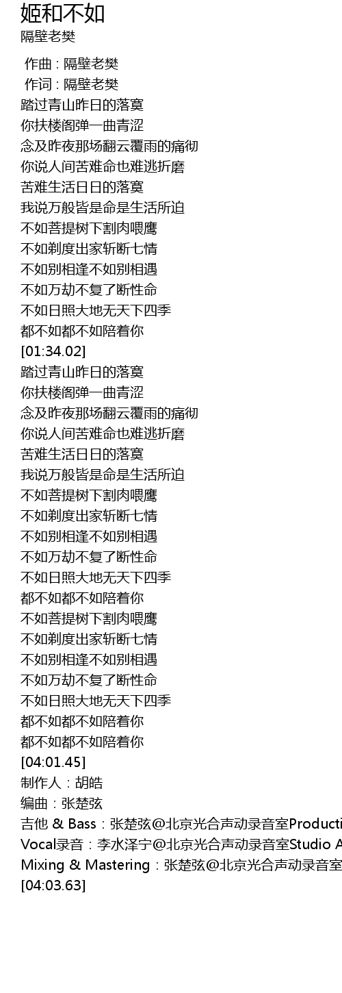 | [04:03.27] | Mixing Mastering: zhang chu xian bei jing guang he sheng dong lu yin shi Studio A |