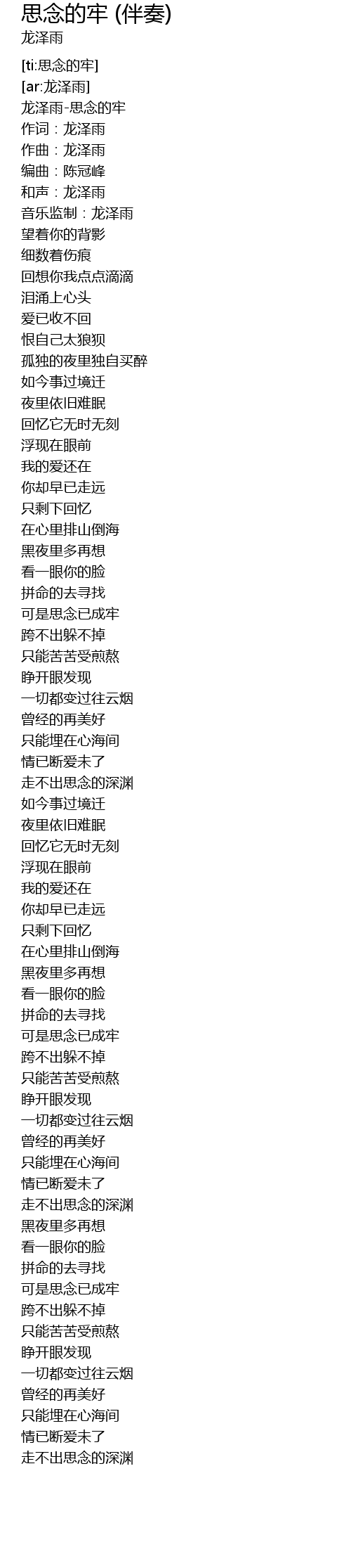 | [00:00.69] | 龙泽雨-思念的牢 |