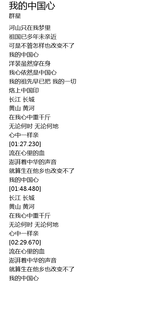 | [00:50.680] | wǒ xīn yī rán shì zhōng guó xīn |