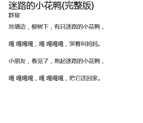 | 池塘边,柳树下,有只迷路的小花鸭, | |