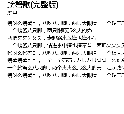 | [女合声]螃呀么螃蟹哥,八呀八只脚,两只大眼睛,一个硬壳壳。 | |