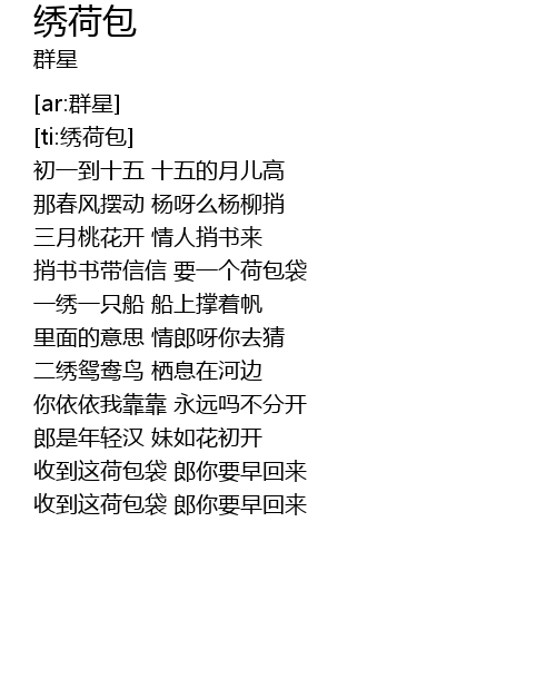 | [01:38.34] | 捎书书带信信 要一个荷包袋 |