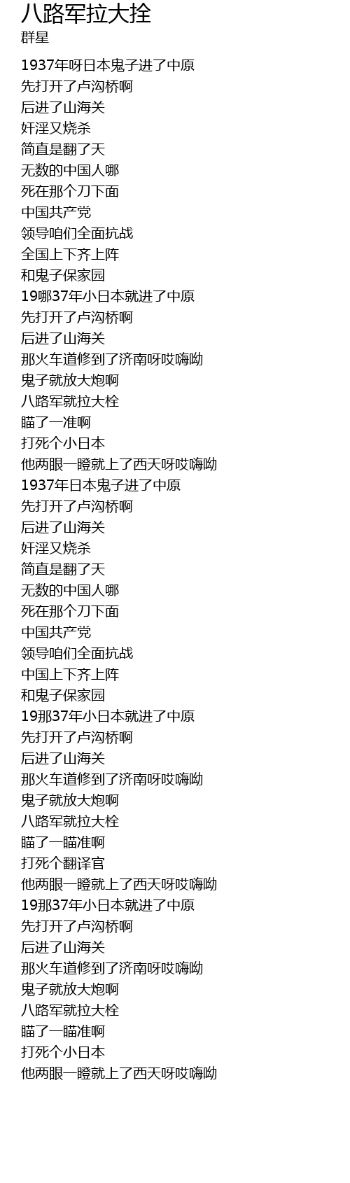 | [00:22.620] | 1937 nián ya rì běn guǐ zi jìn le zhōng yuán |