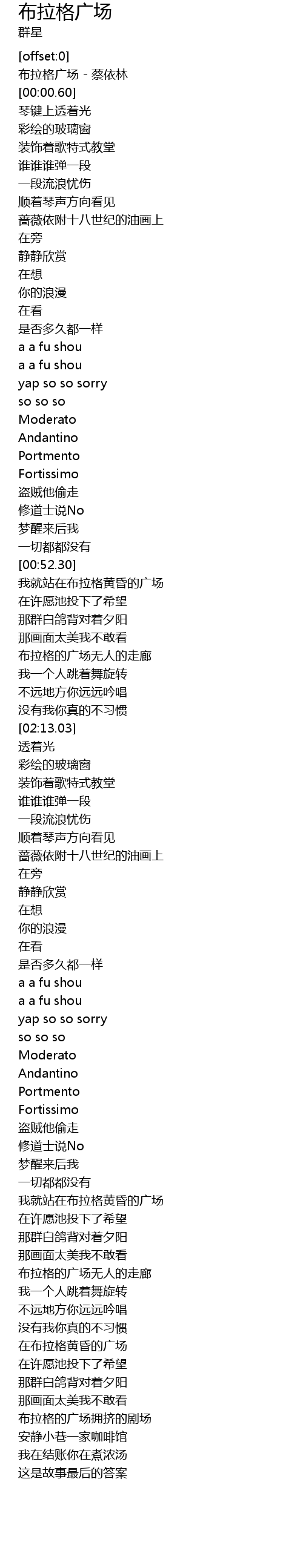 | [00:00.10] | 布拉格广场 - 蔡依林 |