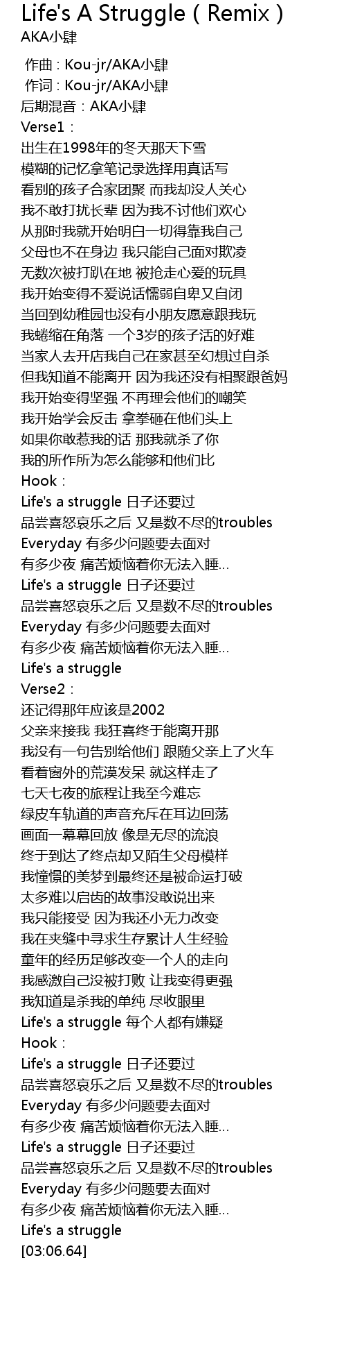 | [02:22.50] | Life' s a struggle rì zi hái yào guò |