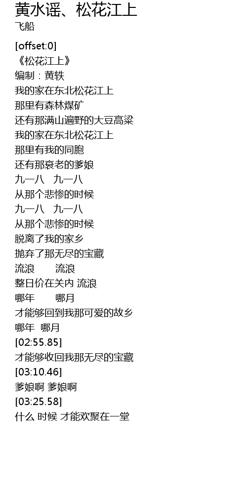 | [00:39.09] | wǒ de jiā zài dōng běi sōng huā jiāng shàng |
