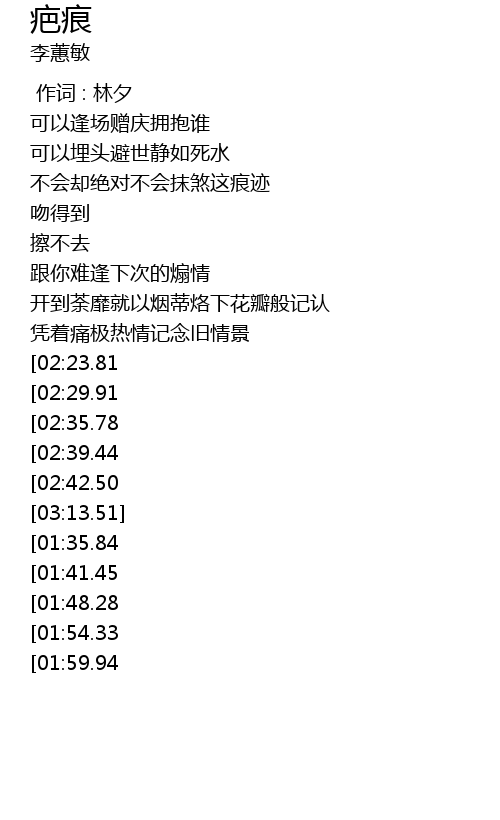 | [02:59.79][02:35.78][01:23.58] | 曾盛放过的伤痕 |