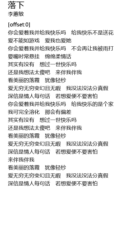 | [00:17.18] | nǐ huì ài zhe wǒ bìng gěi wǒ kuài lè ma gěi wǒ kuài lè bú shì sòng huā |