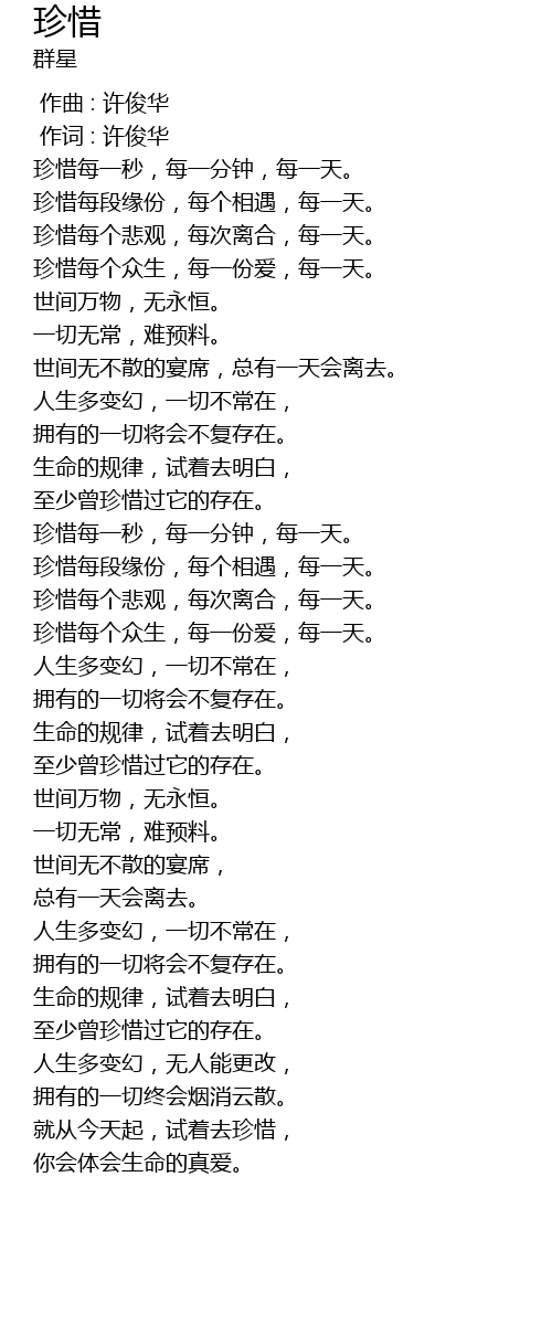 | [00:32.717] | zhen xi mei duan yuan fen, mei ge xiang yu, mei yi tian. |