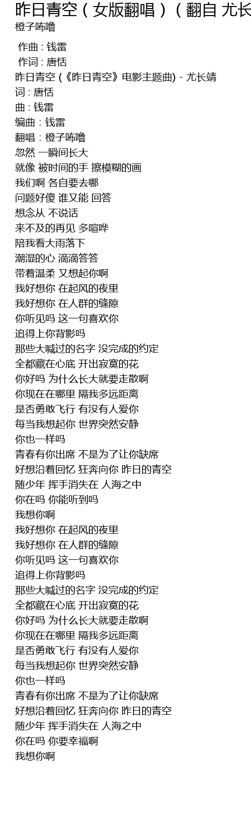 | [00:00.33] | 昨日青空 (《昨日青空》电影主题曲) - 尤长靖 |